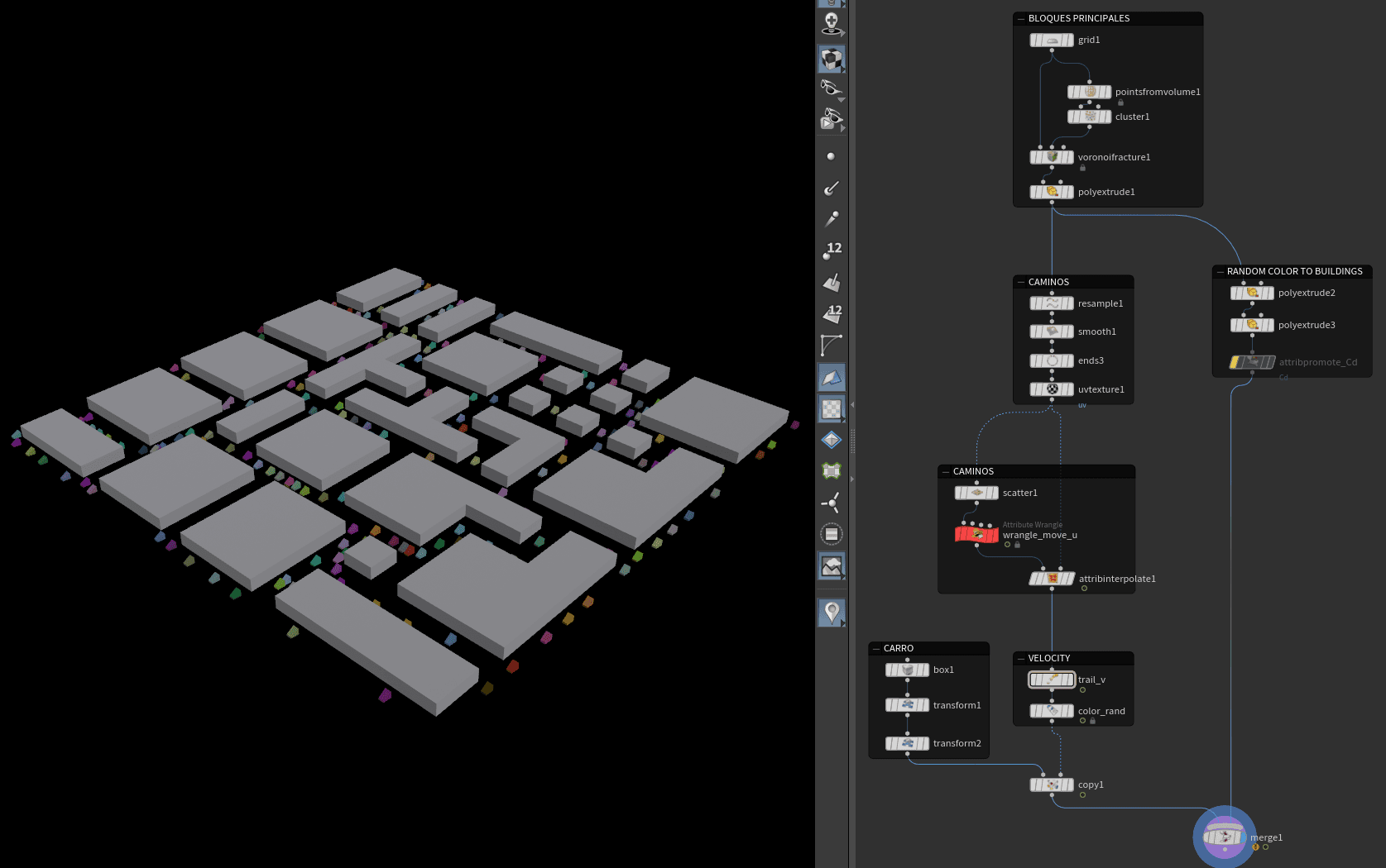 Sistema procedural que crea una ciudad modular con bloques, caminos y autos animados. El tráfico se controla con lógica VEX para simular comportamiento natural, integrando variaciones de velocidad, dirección y ruido procedural.