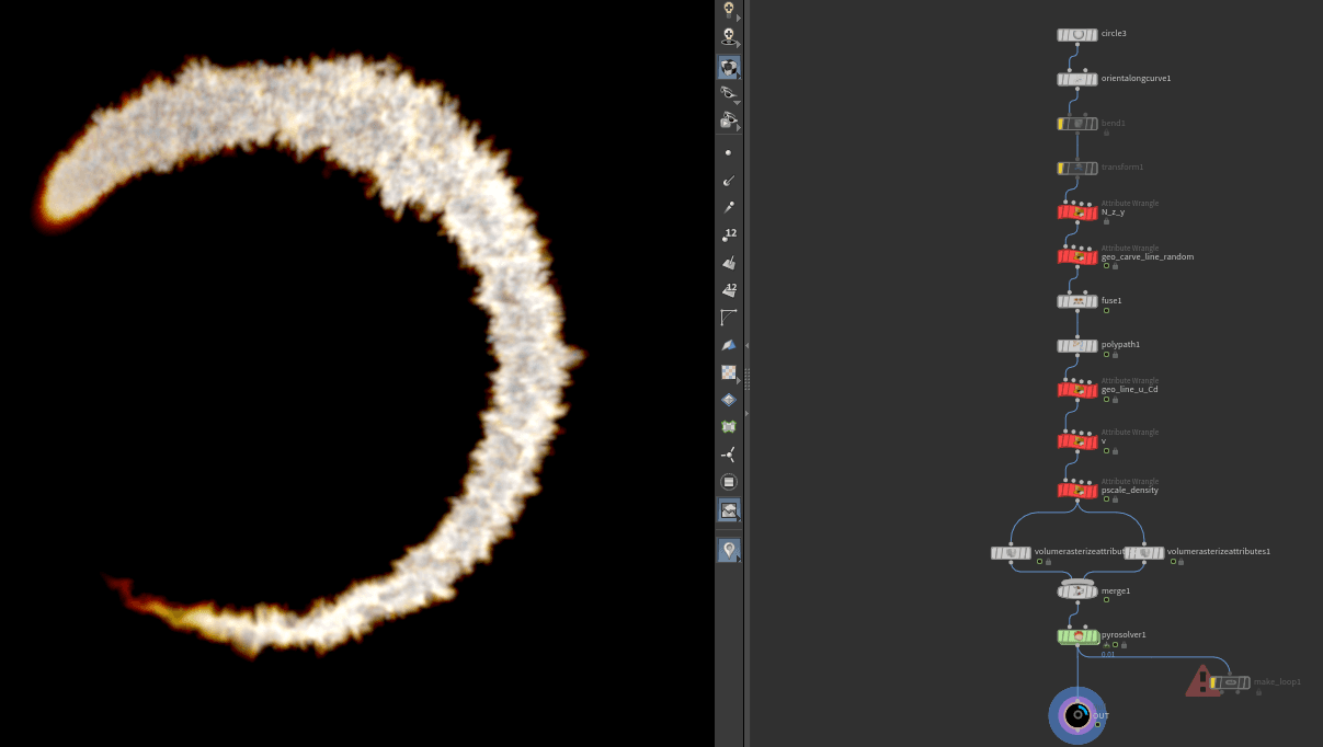 Aprende a generar un anillo de fuego dinámico que se forma a partir de una curva animada, combinando nodos de animación y control de emisión procedural con VEX.